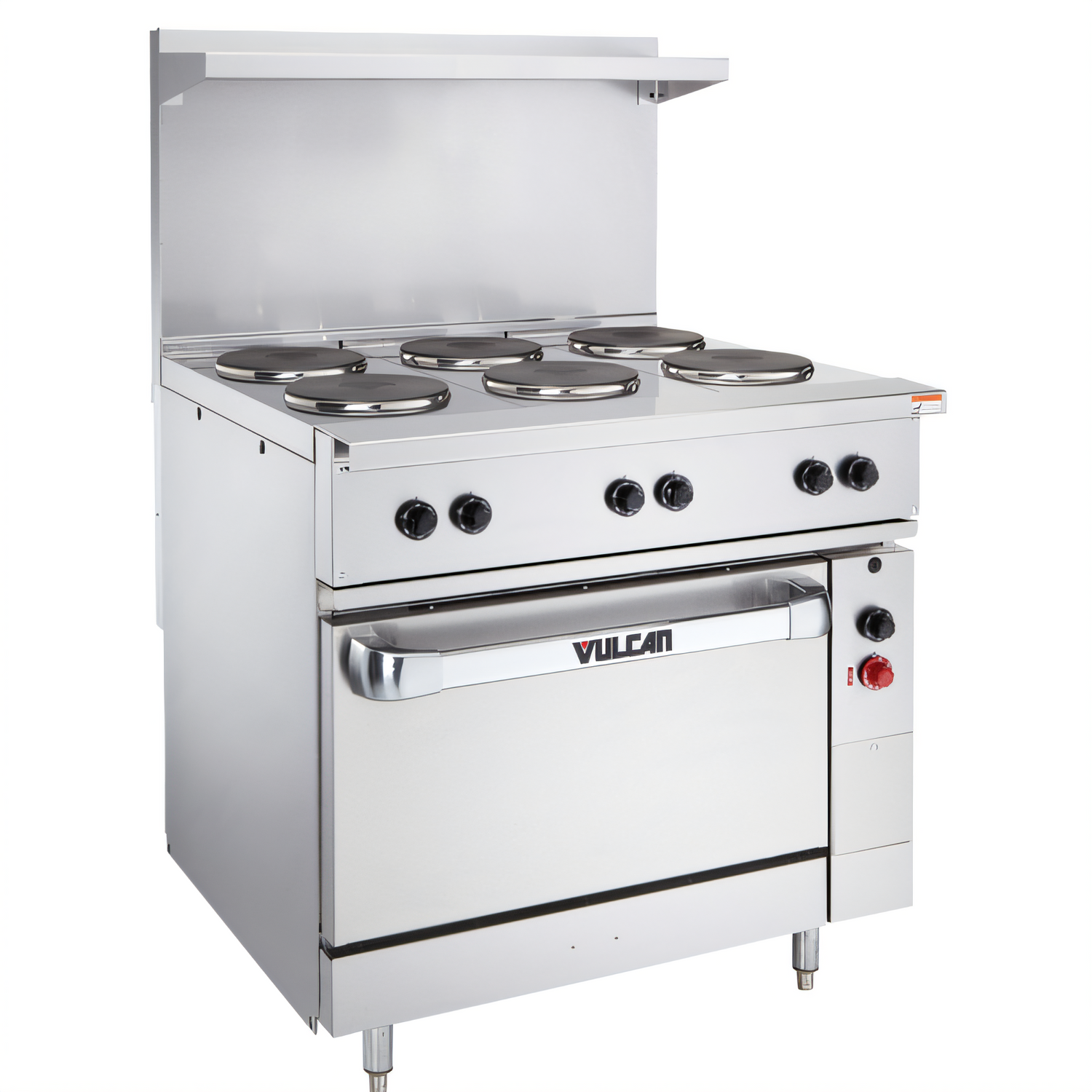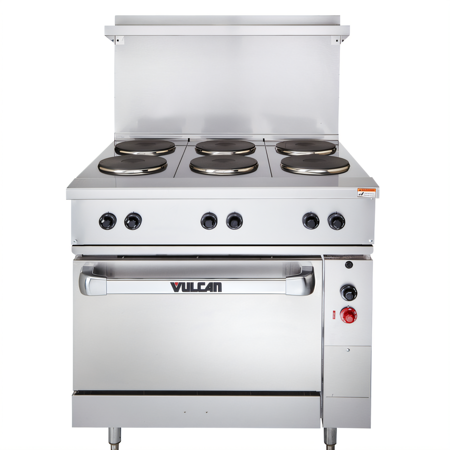 Vulcan 36" electric restaurant range with 4 French hotplates, 12" griddle, oversized oven, stainless steel, NSF-listed, 208V.