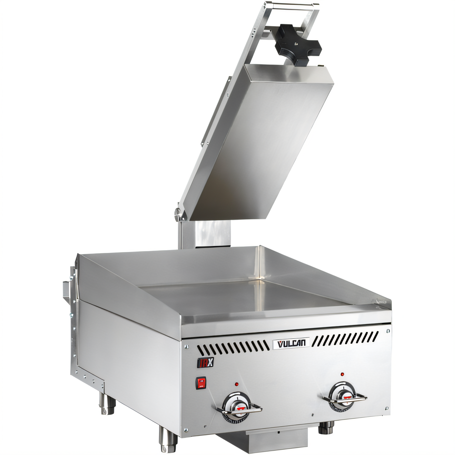 Griddle Clamshell Hood, electric, 10.4" W x 22.9" D, grooved steel plate, thermostatic control, 200-450° F, LED indicator lights, anodized aluminum arm, stainless steel front, top & sides, includes: (2) Teflon sheets & plate gap adjustment accessory, 3.6kW, 208v/50/60/1-ph, 17.3 amps, NSF, cCSAus