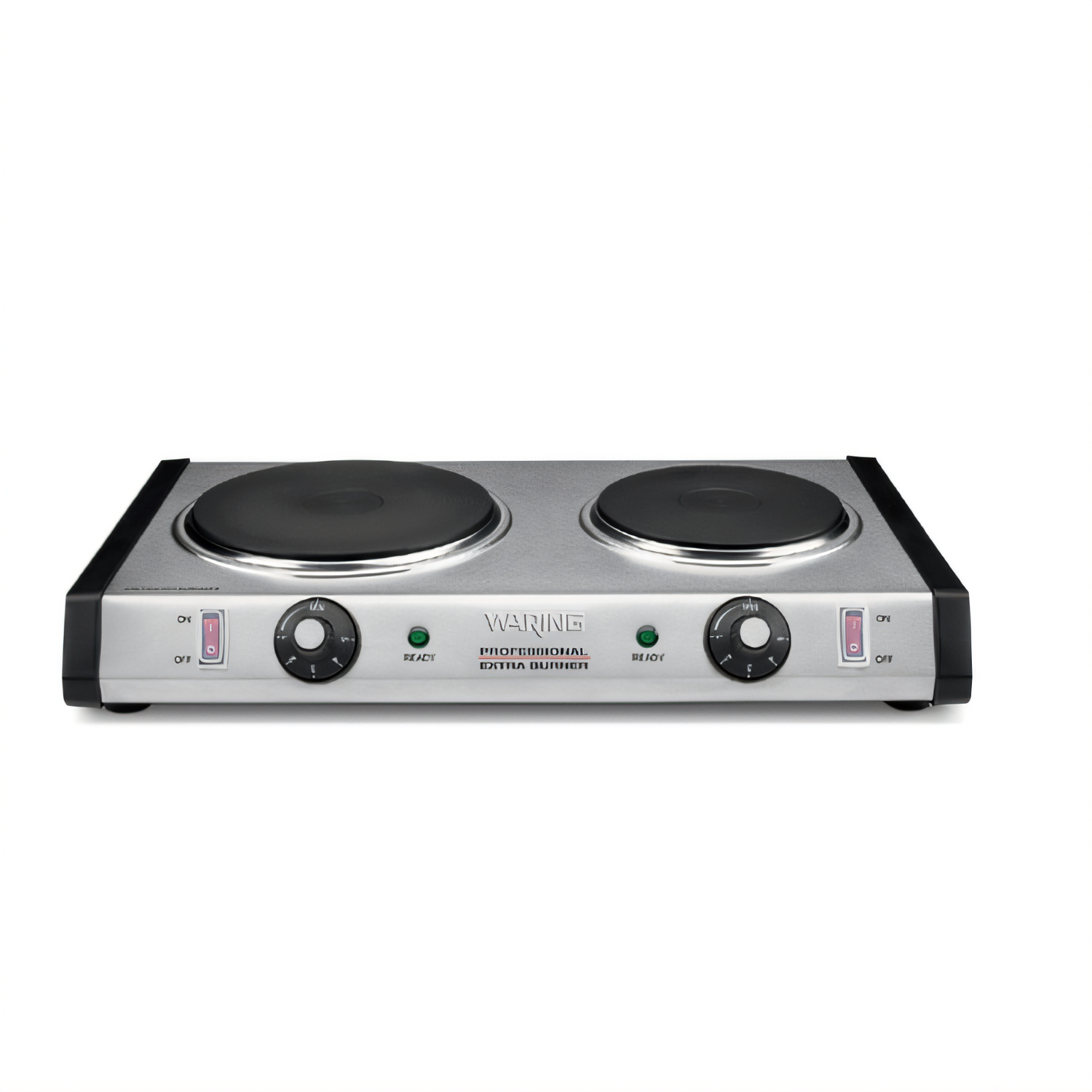 Commercial Burner, 19-3/4" W, double, heavy-duty, cast iron burner plates, independent adjustable thermostats, non-slip rubber feet, brushed stainless steel housing, 1300 watt large plate, 500 watt small plate, total 1800 watts, 120v/60/1ph, 15 amps, cULus, NSF