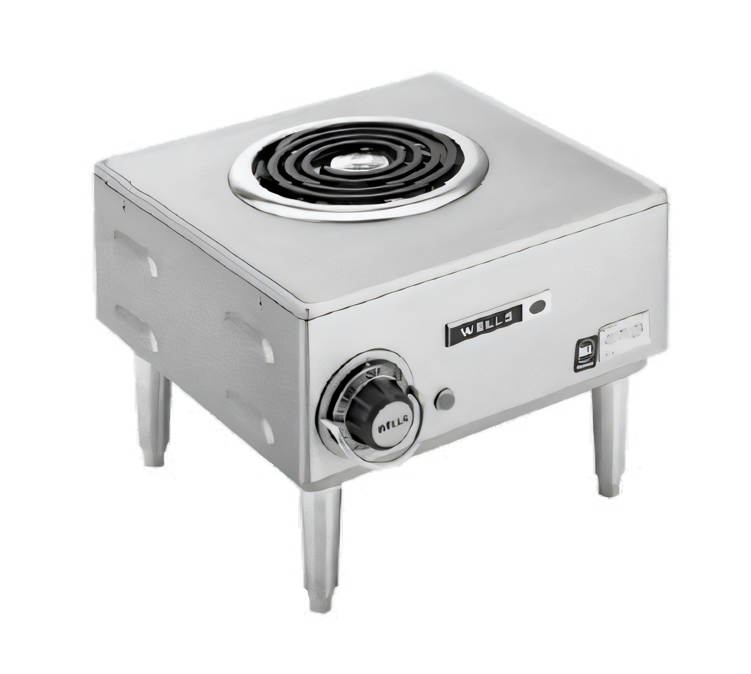 Hotplate, countertop, electric, 12-13/16" W, single burner, flat spiral element, stainless steel construction, adjustable heat control, with 4" high adjustable stainless steel legs, 120v/60/1-ph, 1.5kW, 12.5 amps, NEMA 5-15P, NSF