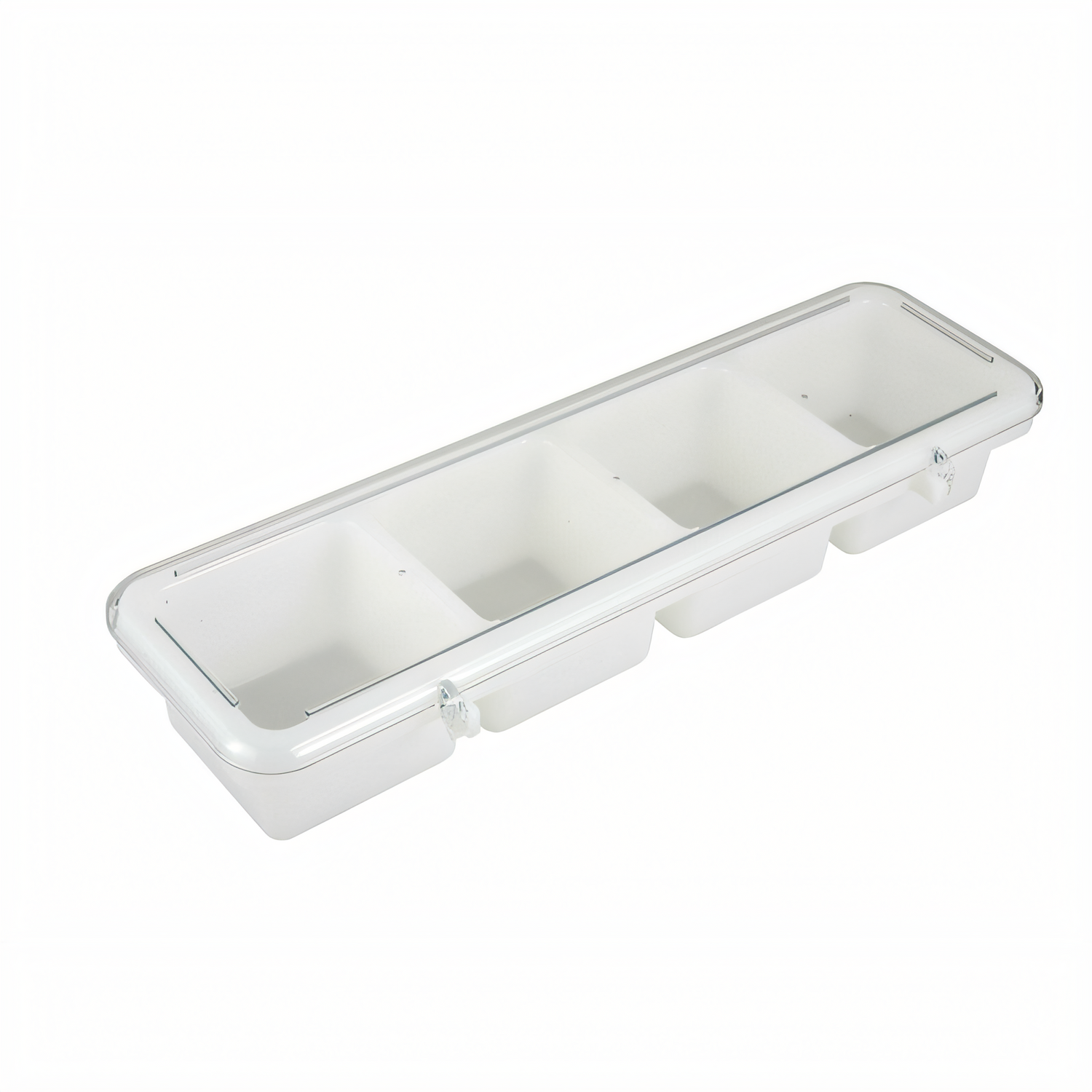 Winco BC-4P 4-compartment bar garnish caddy, 18"x5"x3" ABS with cover — durable, sanitary storage for garnishes.