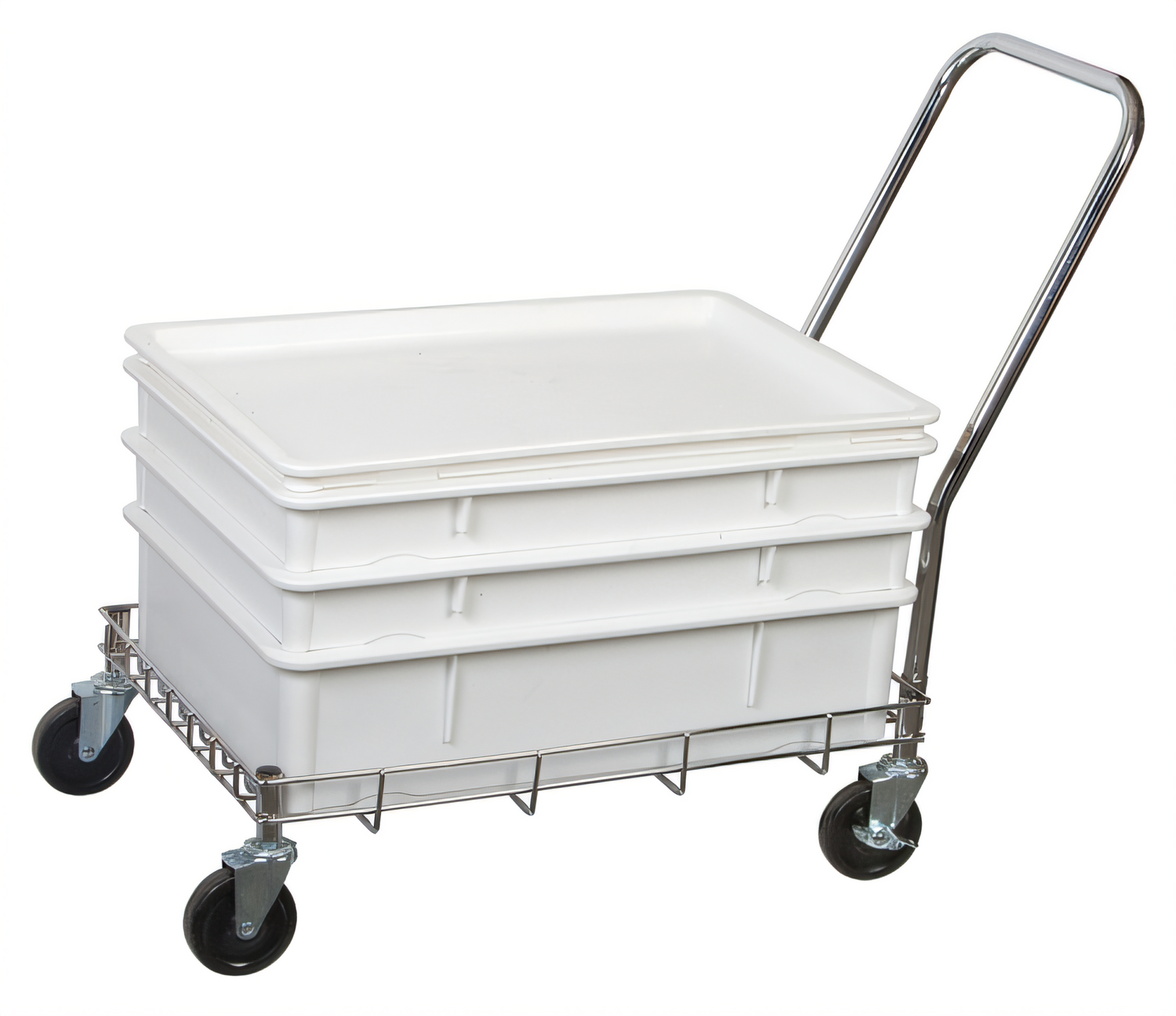 Dolly, 27"L x 18-1/4"W x 2-1/2"H (height does not include handle or casters), for dough boxes, with handle, accepts 18" x 26" dough boxes, 400 lb. capacity, wire construction, 3-3/4" dia. casters (2) with brakes (2) without brakes, (Qty Break = 1 each)