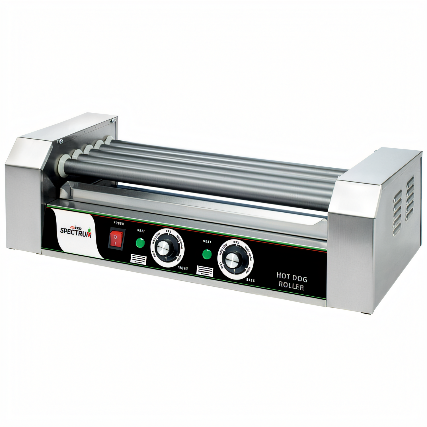 Spectrum™ RollsRight™ Hot Dog Grill, roller type, capacity: 12 hot dogs, multiple power levels, (2) independent thermostatic heat controls (front & rear), teflon non-stick coated rollers with sealed ends, heavy duty sealed motor, bike chain & sprocket drive assembly, heating elements in each roller, re-settable fuse, stainless steel full size drip tray & body, non-skid rubber feet, 110v/60/1-ph, 700 watts, 6.3 amps, NEMA 5-15P, cETLus, ETL (Qty Break = 1 each)