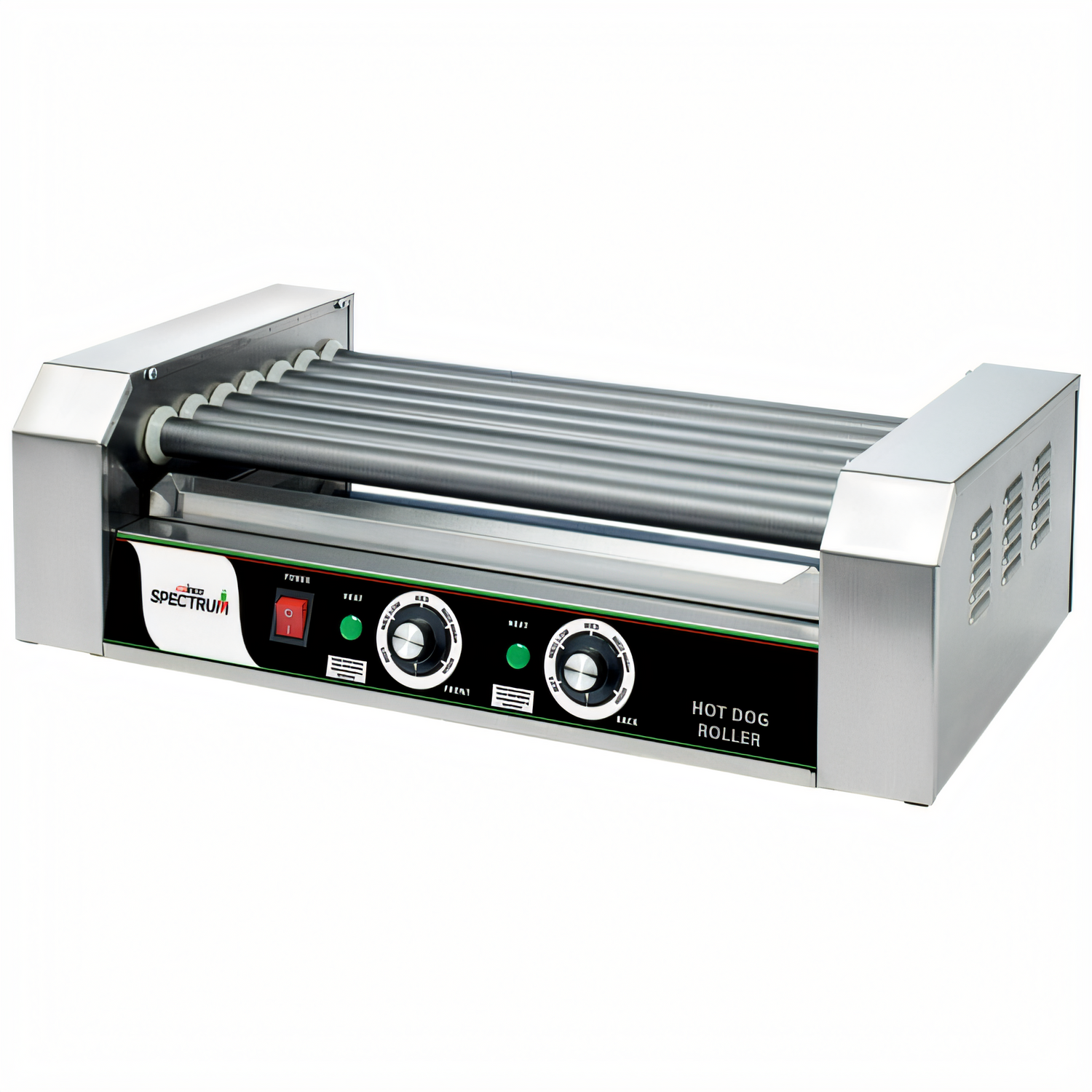 Spectrum™ RollsRight™ Hot Dog Grill, roller type, capacity: 18 hot dogs, multiple power levels, (2) independent thermostatic heat controls (front & rear), teflon non-stick coated rollers with sealed ends, heavy duty sealed motor, bike chain & sprocket drive assembly, heating elements in each roller, re-settable fuse, stainless steel full size drip tray & body, non-skid rubber feet, 110v/60/1-ph, 900 watts, 8.1 amps, NEMA 5-15P, cETLus, ETL (Qty Break = 1 each)