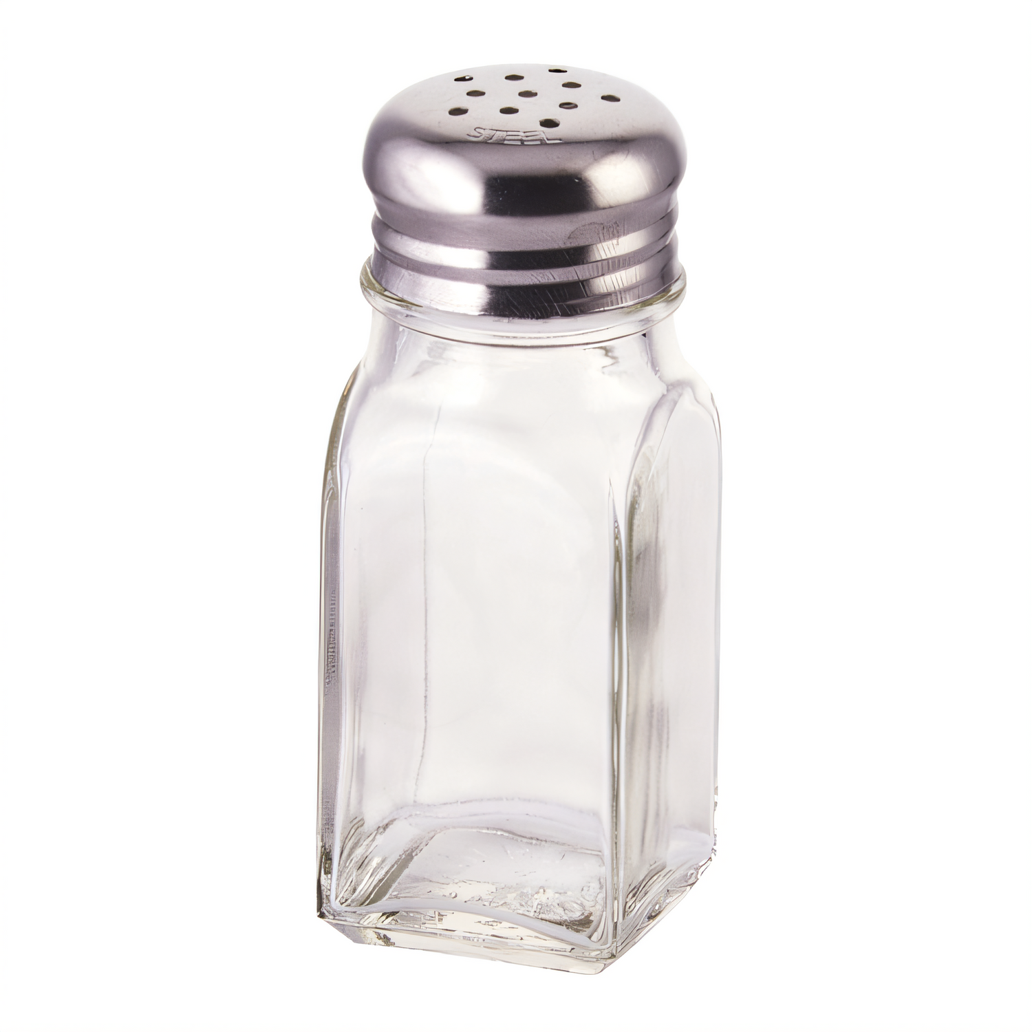Glass Shaker, 2 oz., square, with 18/0 stainless steel mushroom top, glass (Qty Break = 12 dozen)