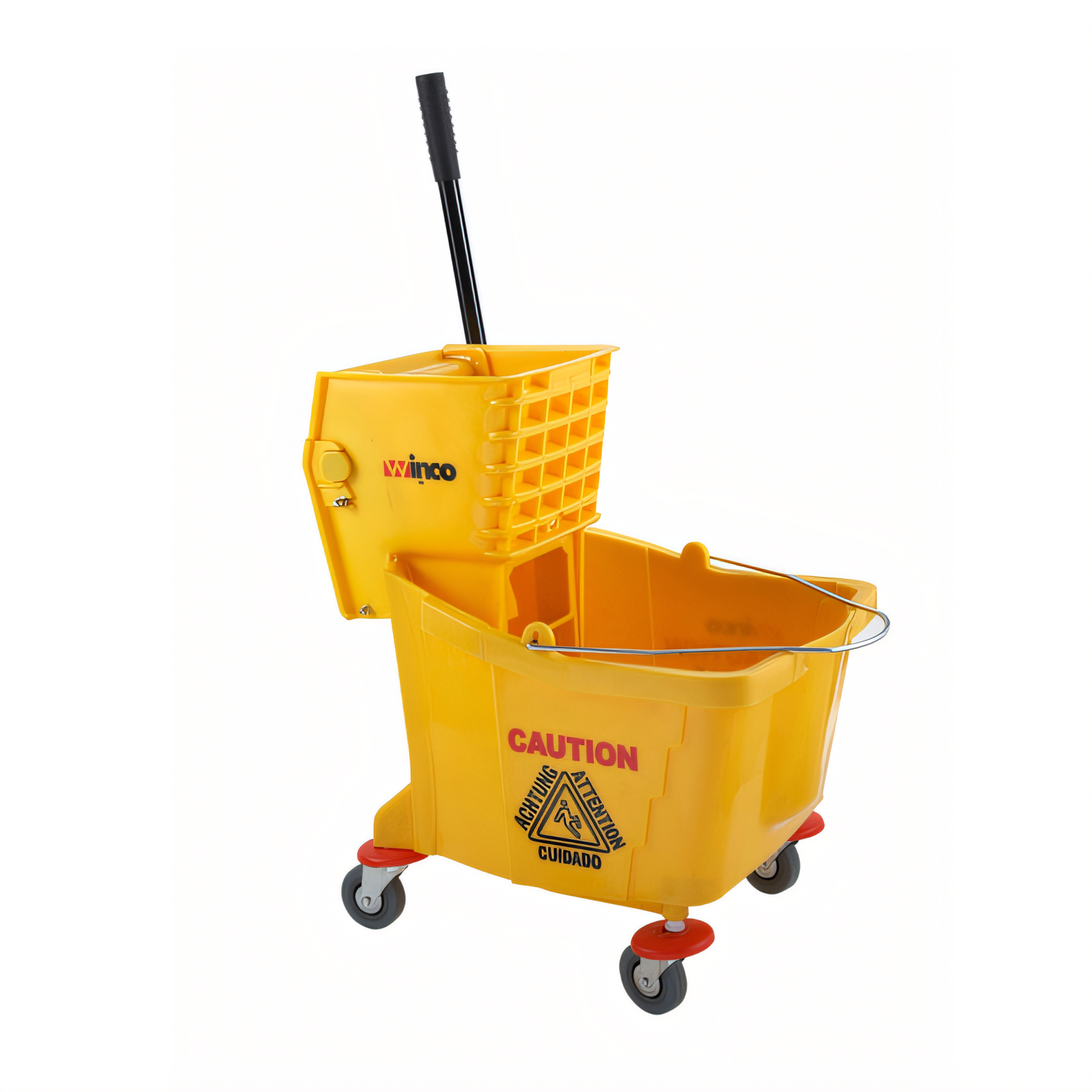 Winco MPB-36 36-qt yellow mop bucket with wringer—durable commercial cleaning, easy wringing and maneuvering for efficient janitorial work.