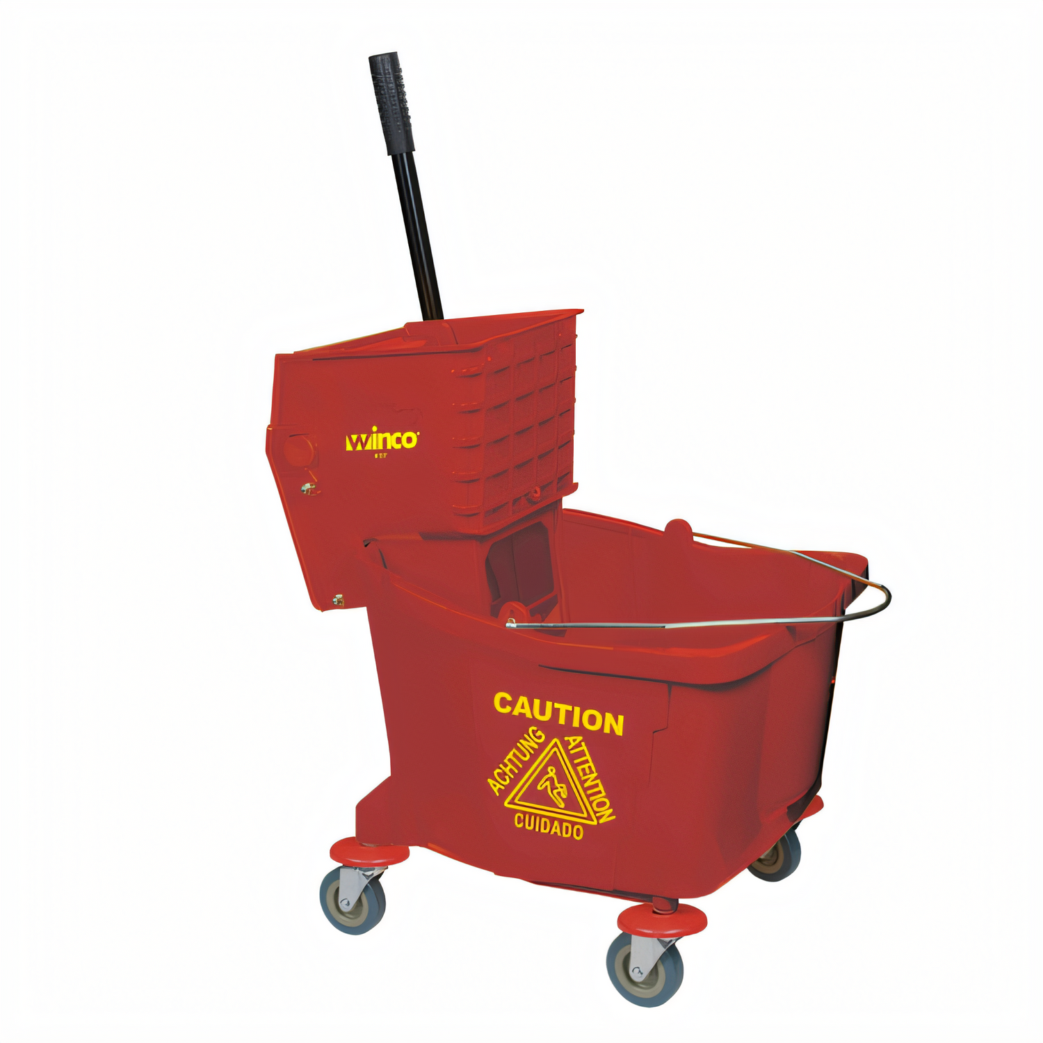 Winco MPB-36R 36-qt red mop bucket with wringer — durable commercial cleaning, easy wringing and maneuvering for efficient floor care.