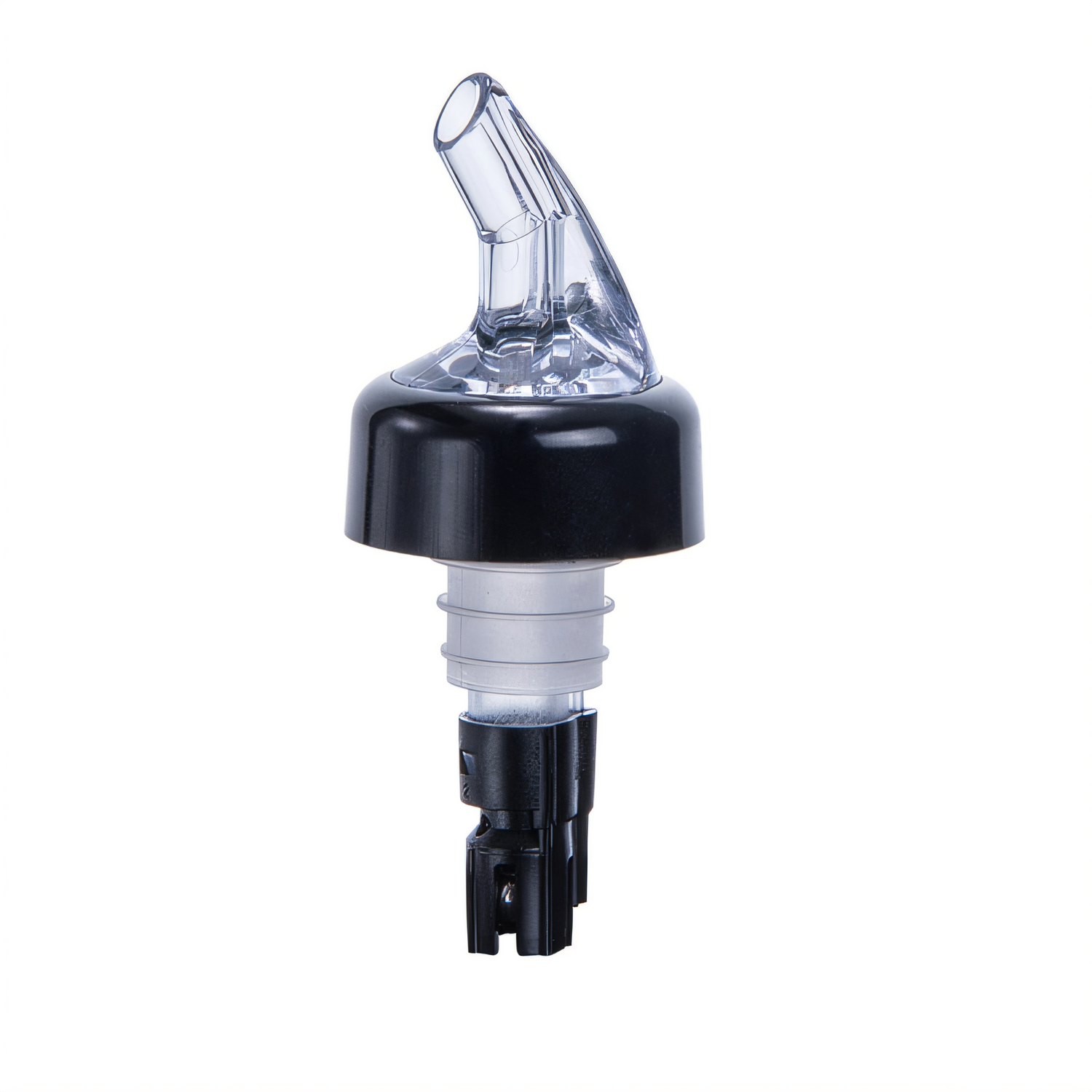 Measuring pourer, 5/8 oz., with black collar, clear spout, inside ball bearing, poly plastic cork, black tail (Qty Break = 10 dozen)