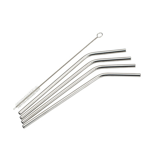 Drinking Straw Set, 5-piece, 1/4" dia. x 8-1/2"H, curved, includes: (4) straws and (1) cleaning brush, dishwasher safe, 18/8 stainless steel (Qty Break = 12 set)