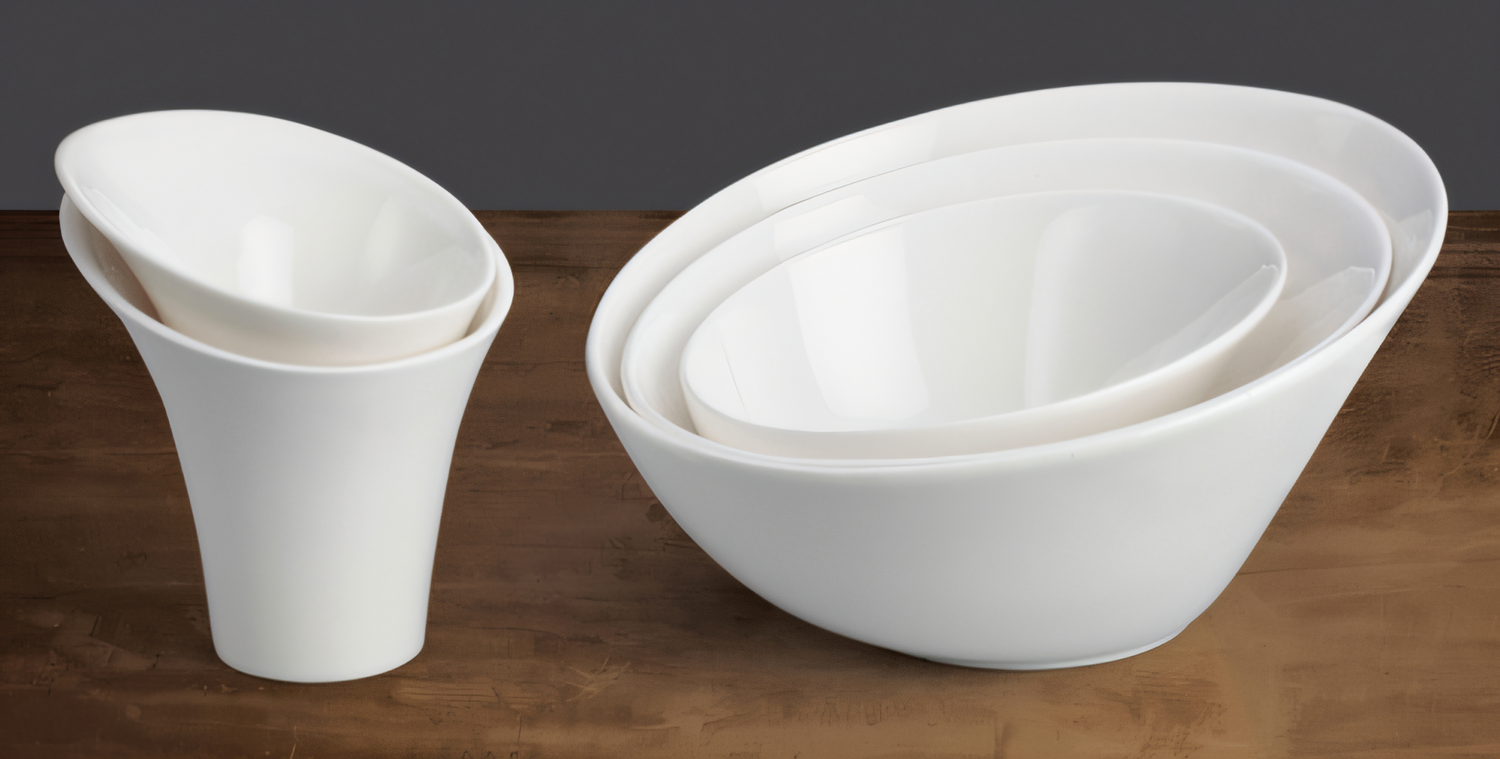Winco Ardesia 8oz porcelain snack cups, 5" x 5", creamy white, angled rim, dishwasher-safe, sold 24/case for commercial use.