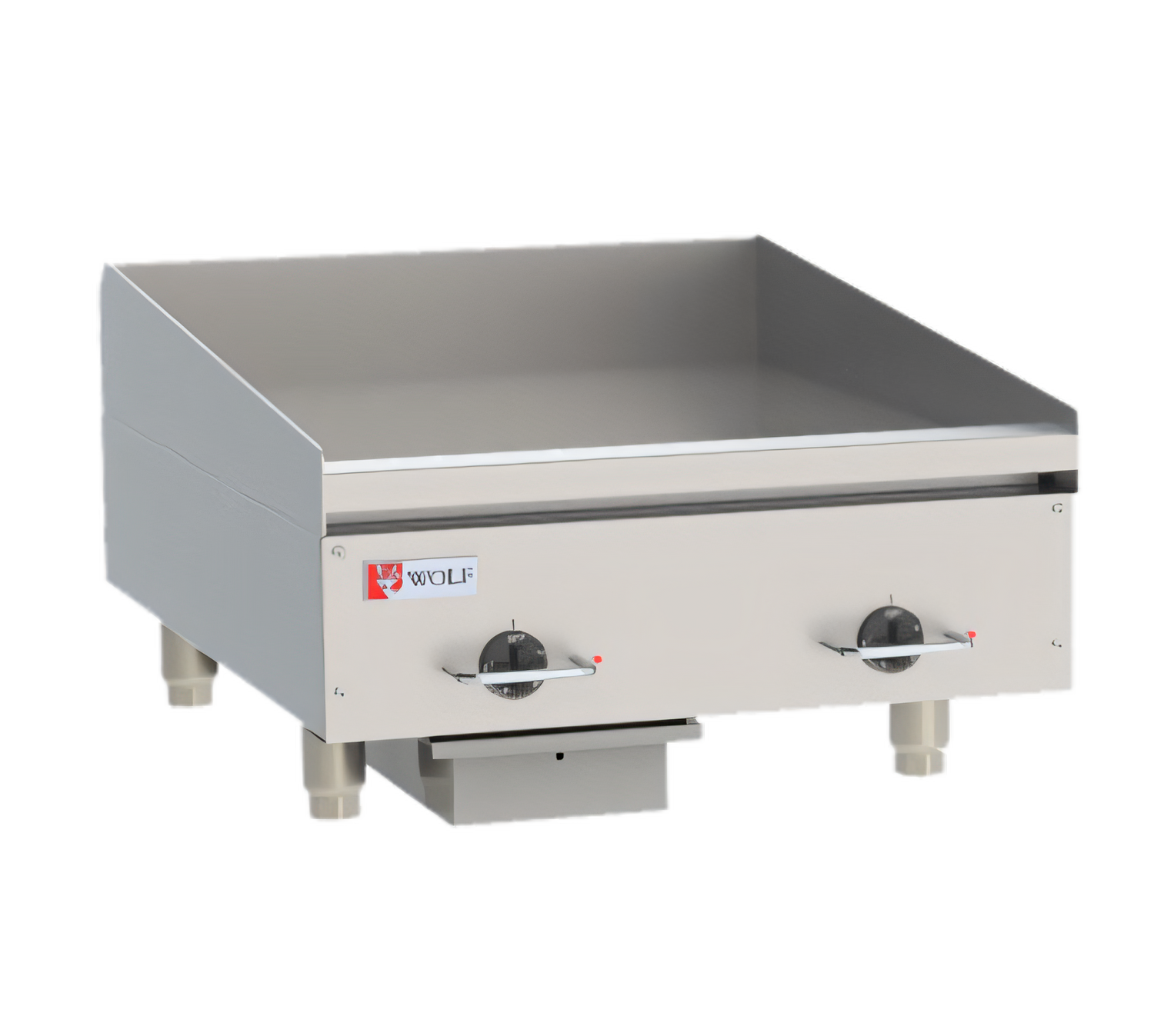 Wolf WEG24E Electric Griddle — Heavy-duty 24" countertop griddle with a 24" x 24" cooking surface and 1/2" polished steel plate for even heat. Bottom-mounted snap-action thermostats every 12" ensure precise temperature control; stainless steel construction with Cool Bullnose front, front grease trough, back and tapered side splashes, and 4" adjustable legs. NSF and UL listed for commercial kitchens.